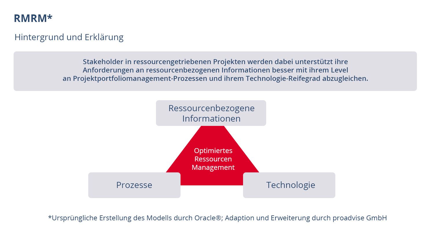 Das RMR-Modell unterstützt Stakeholder in ressourcengetriebenen Projekten dabei, ihre Anforderungen an ressourcenbezogene Informationen besser mit ihrem Level an Projektportfoliomanagement-Prozessen und ihrem Technologie-Reifegrad abzugleichen. Dazu werden die Parameter Prozesse, ressourcenbezogene Informationen und die verfügbare Technologie berücksichtigt. Das Ziel ist dabei immer, ein optimiertes Ressourcenmanagement durchzusetzen. Das RMR-Modell stammt ursprünglich von Oracle®. Die proadvise GmbH steuerte später zahlreiche Adaptionen und Erweiterungen bei.