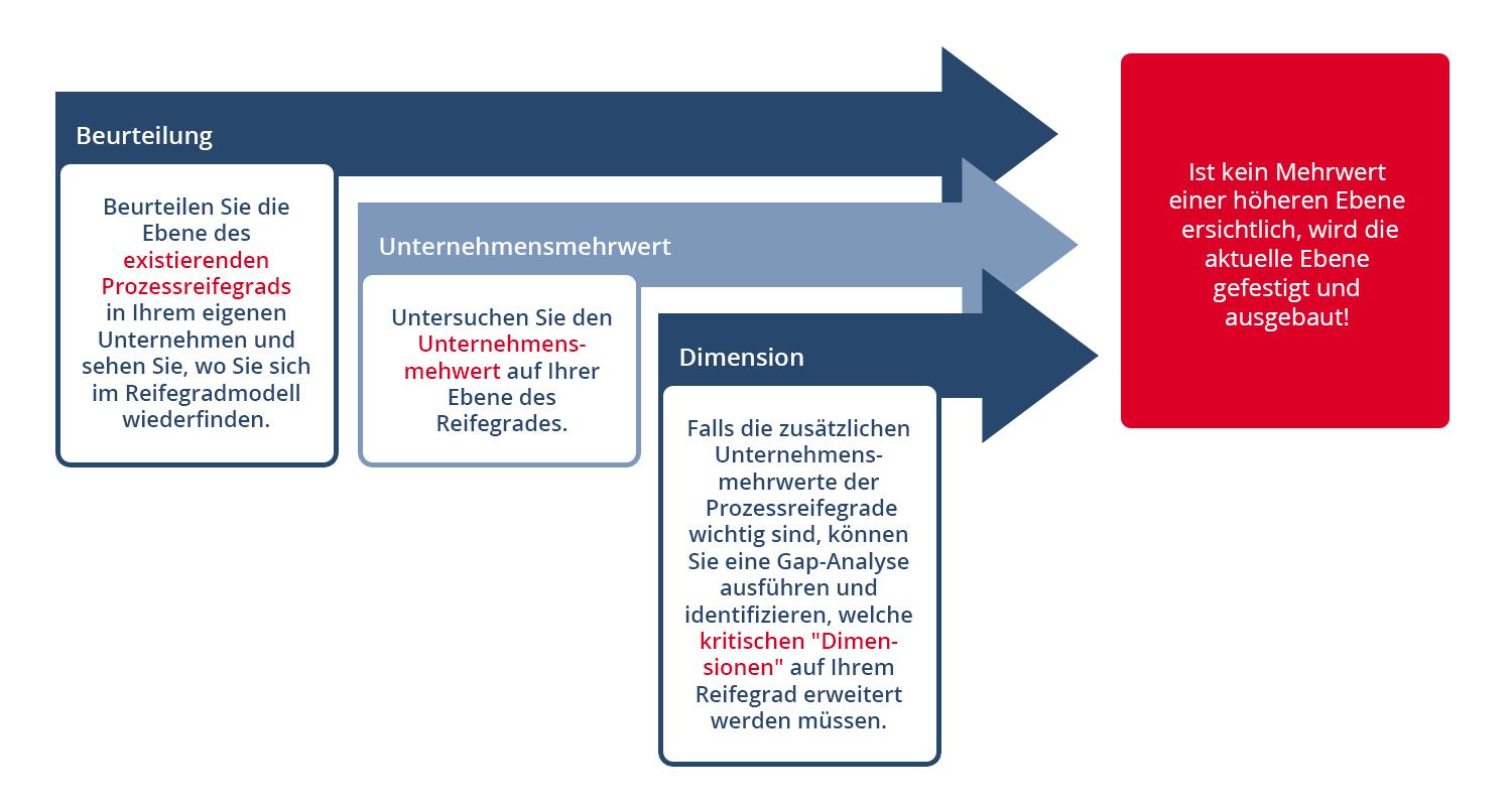 Falls die zusätzlichen Unternehmensmehrwerte der Prozessreifegrade wichtig sind, können Sie eine Gap-Analyse ausführen. Damit identifizieren Sie, welche kritischen „Dimensionen“ auf Ihrem Reifegrad erweitert werden müssen, um zu einem höheren Reifegrad aufzusteigen.