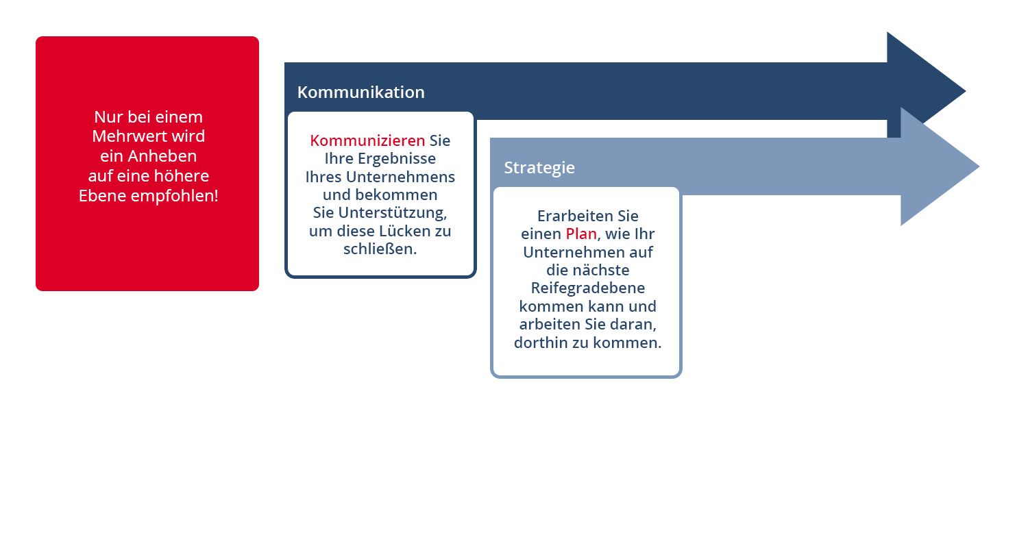 Wichtig: Ist kein Mehrwert einer höheren Ebene ersichtlich, dann sollte die aktuelle Ebene gefestigt und ausgebaut werden! Ein Anheben auf den nächsthöheren Reifegrad wird nur bei einem absehbaren Mehrwert empfohlen!
