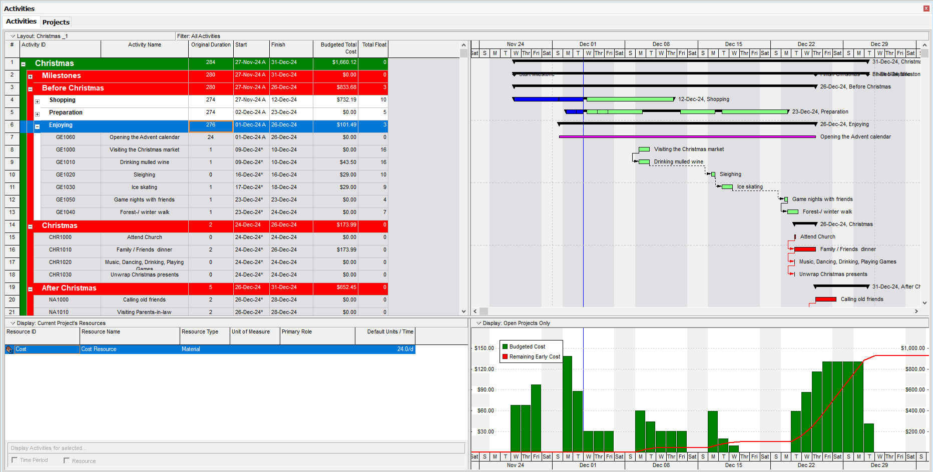 Unser Weihnachtsprojekt startete mit einem Kick-off, bei dem unser Weihnachtsplaner gemeinsam mit unserem Consulting-Team die Ziele für die bevorstehende Weihnachtszeit definierte. Mithilfe von Oracle Primavera P6 erstellten wir einen detaillierten Terminplan, der sämtliche Aktivitäten von der Geschenkebeschaffung über die Festtagsdekoration bis zur entspannten Zeit nach dem Weihnachtsfest umfasste.